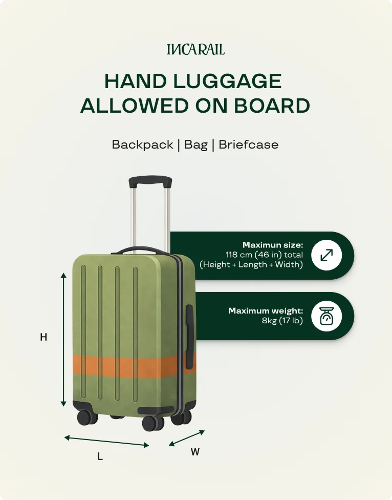 INCA RAIL carriages / vans do not have luggage racks on board. Each travel ticket entitles its bearer to board the train / vans with only one piece of hand luggage (backpack, handbag, or briefcase) weighing no more than 08 kg/17 lb and with dimensions of no more 46 linear inches / 118 linear cm (height + length + width).