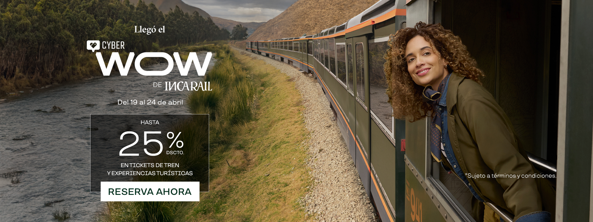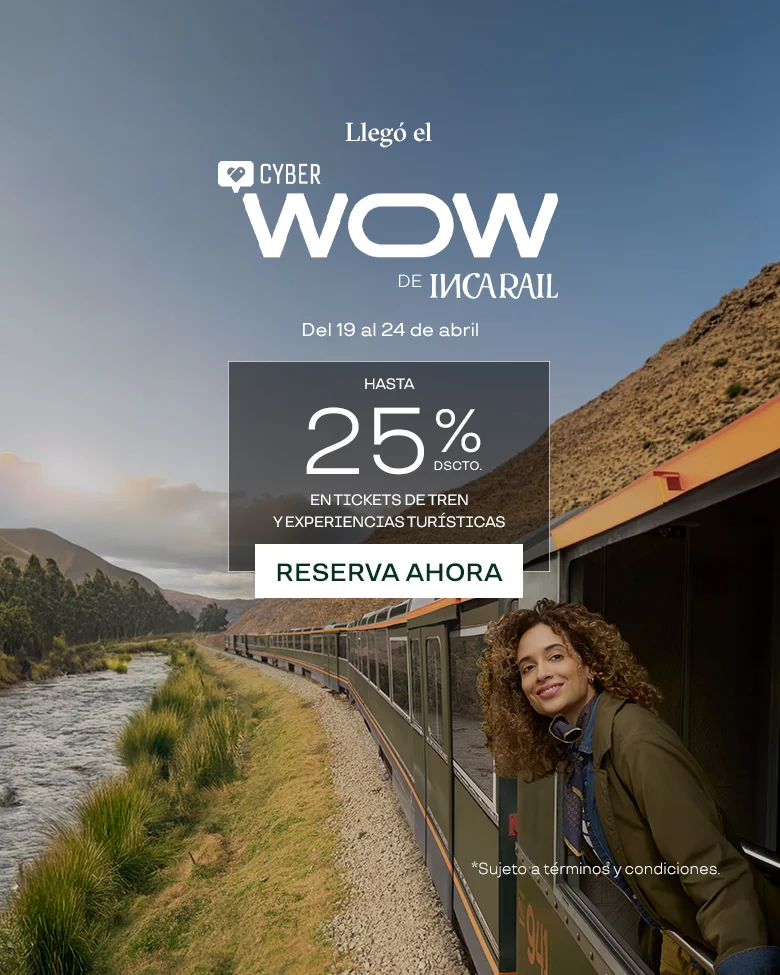Términos y Condiciones: PROMOCIÓN WOW25. Válido para el servicio The 360° Machu Picchu Train en las frecuencias 61,62,64 y 65, The Prime Machu Picchu Train en las frecuencias 41,43,44 y 46 y The Voyager Machu Picchu Train en la frec 68 . Boletos válidos para comprar del 19 al 24 de Abril del 2026. Tarifa con hasta el 25% de descuento. Válido para viajar del 28 de Abril al 30 de Junio del 2026. Solo aplica para pasajero directo adulto. No aplica para agencias o grupos. Tarifa promocional no permite cambios ni devoluciones. Sujeto a disponibilidad de espacios y/o hasta agotar stock. Válido para compras en boleterías y web. Promoción válida para The Prime en la frec 46 hasta Abril. Válido para servicio de transporte en tren (Ollantaytambo - Machu Picchu) y (Machu Picchu-Ollantaytambo) en The 360° Machu Picchu Train en las frecuencias 61,62,64 y 65, The Prime Machu Picchu Train en las frecuencias 41,43,44 y 46 y The Voyager Machu Picchu Train en la frec 68 . Válido para servicio de transporte en tren (Cusco - Machu Picchu) y (Machu Picchu-Cusco) en The 360° Machu Picchu Train en las frecuencias 61 y 64, The Prime Machu Picchu Train en las frecuencias 43,44 y 46.